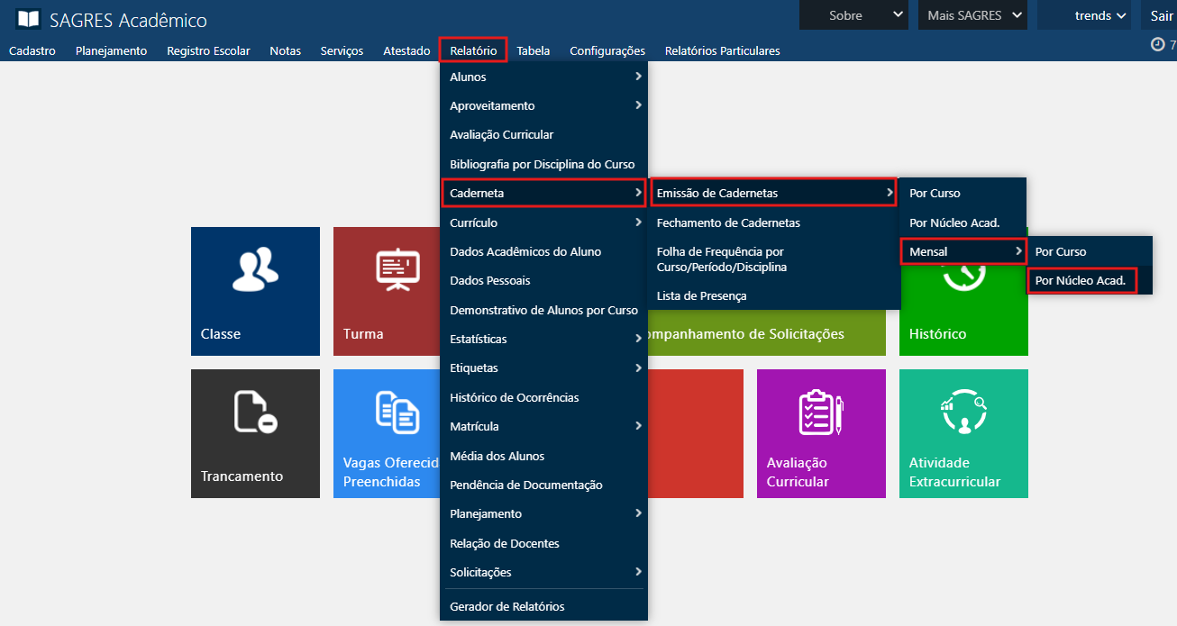 Acessível pelo menu Relatório > Caderneta > Emissão de Cadernetas > Mensal > Por Departamento (ou nomenclatura equivalente), do SAGRES Acadêmico.