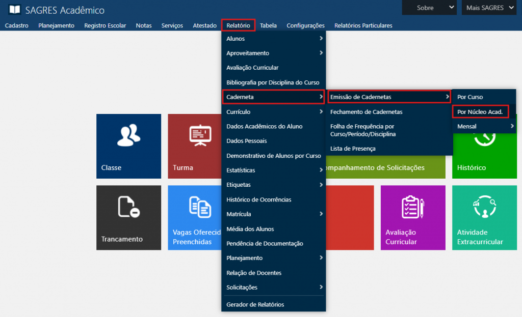 Podemos solicitar a emissão de uma ou mais partes do relatório que pode compor uma Caderneta, especificando também o tipo de Folha de Frequência quando for o caso.