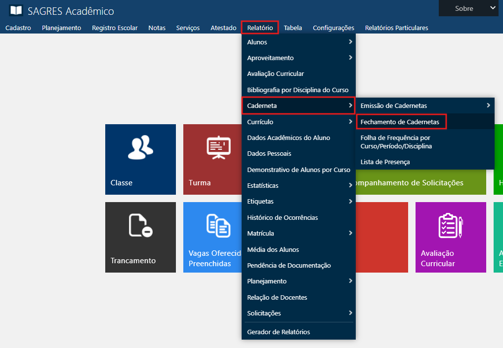 Acessível pelo menu Relatório > Caderneta > Fechamento de Cadernetas, do SAGRES Acadêmico.