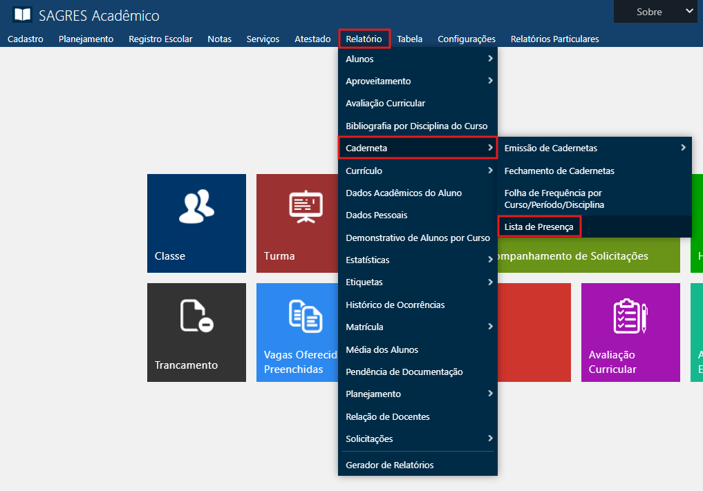 Acessível pelo menu Relatório > Caderneta > Lista de Presença, do SAGRES Acadêmico.