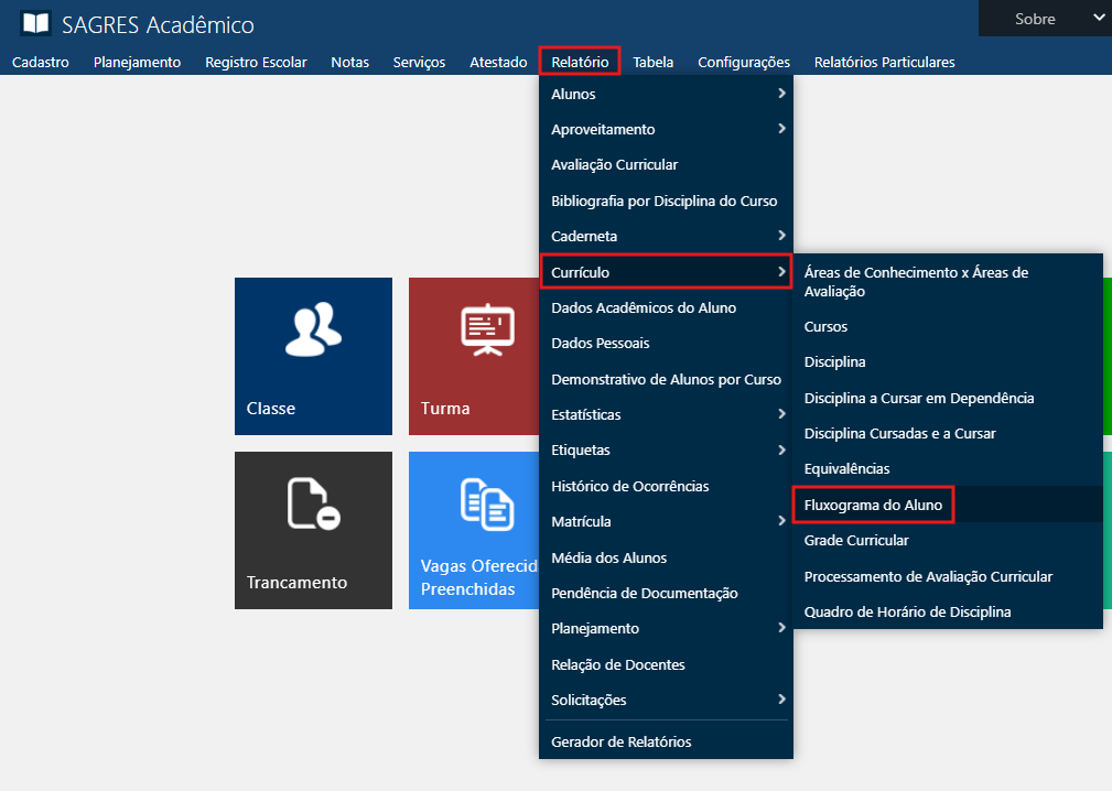 Acessível pelo menu Relatório > Currículo > Fluxograma do Aluno, do SAGRES Acadêmico.