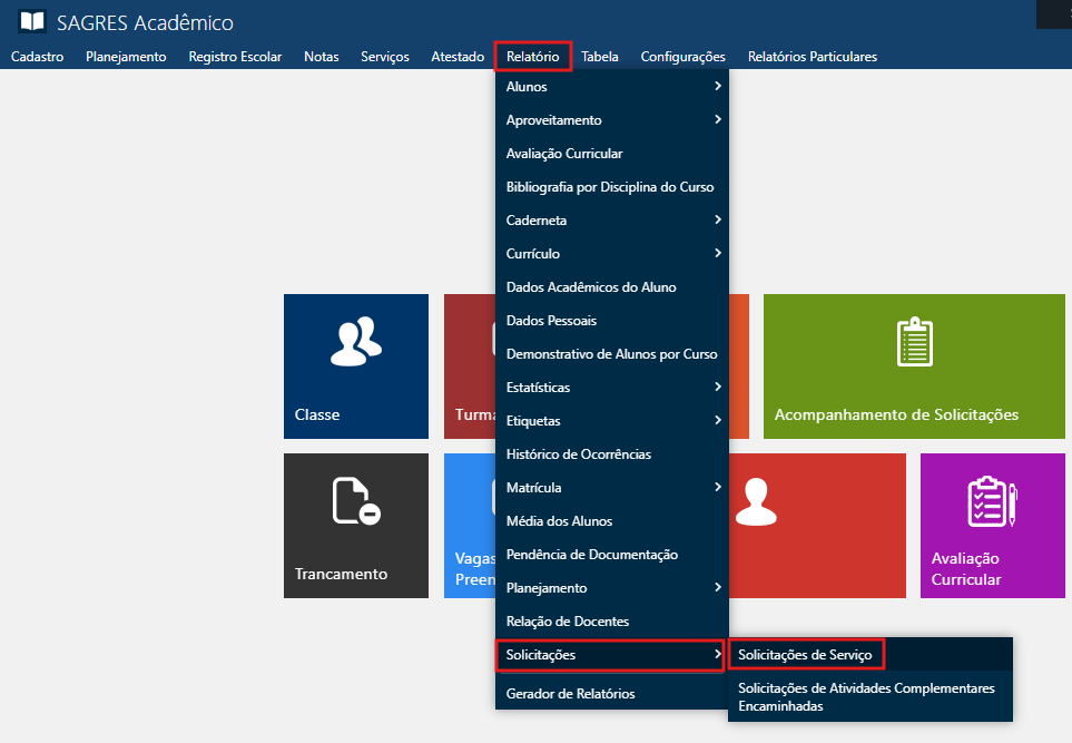 Acessível pelo menu Relatório > Solicitações > Solicitações de Serviço, do SAGRES Acadêmico.