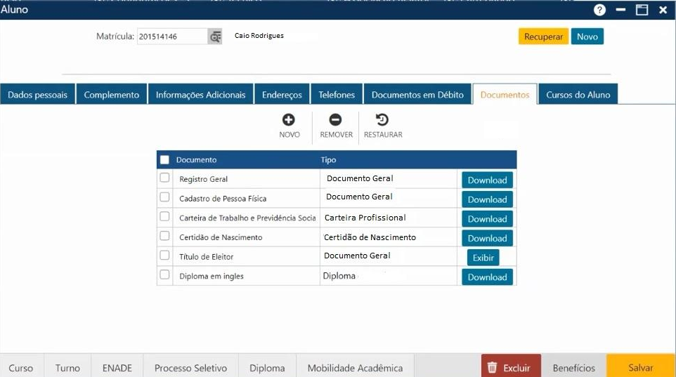 Acionando o botão Novo, o sistema permitirá incluir um novo documento para o Aluno. O botão Remover permitirá que o usuário remova da interface um ou mais documentos já cadastrados. E finalmente, o botão Restaurar, permite a recuperação das informações marcadas para remoção, removidas da interface (botão Remover), mas antes do usuário atualizar as informações no sistema (botão Salvar).