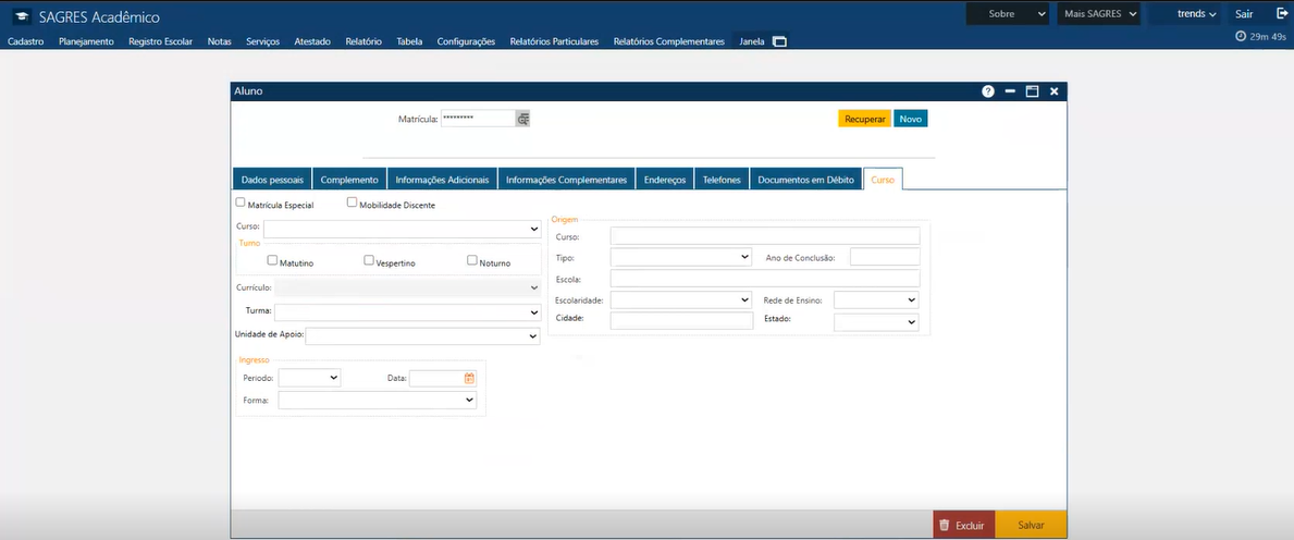 Para registrar as informações do Aluno, a interface tem as seguintes pastas: Dados Pessoais, Complemento, Informações Adicionais, Endereços, Telefones, Documentos em Débito e Cursos do Aluno. Existe um conjunto mínimo de informações que são exigidas para podermos incluir um novo Aluno no sistema.