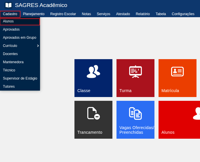 A inclusão de informações no Cadastro de Alunos é pré-requisito para a execução das rotinas que envolvem o registro da vida acadêmica do corpo discente da Instituição.
