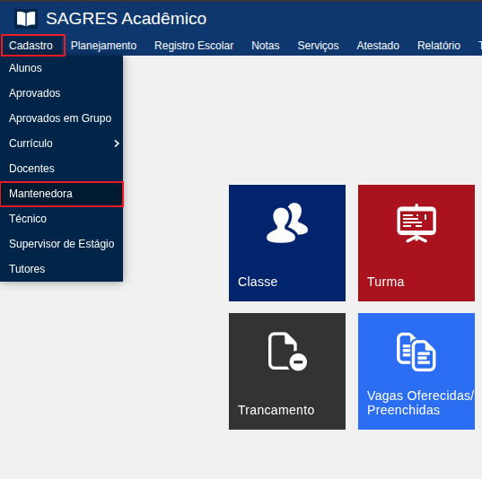 Cadastro contendo informações sobre as Mantenedoras da Instituição. Acessível pelo menu Cadastro > Mantenedora, do Sagres Acadêmico 3 Web, no perfil do Secretário.