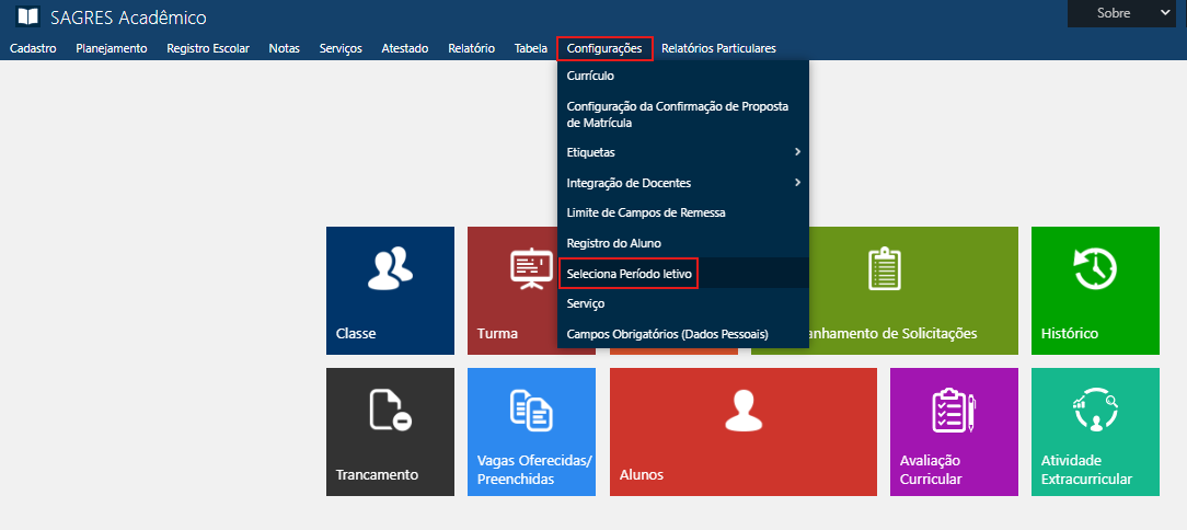 É acessível pelo menu Configurações > Seleciona Período letivo, do Sagres Acadêmico 3 Web, no perfil do Secretário.