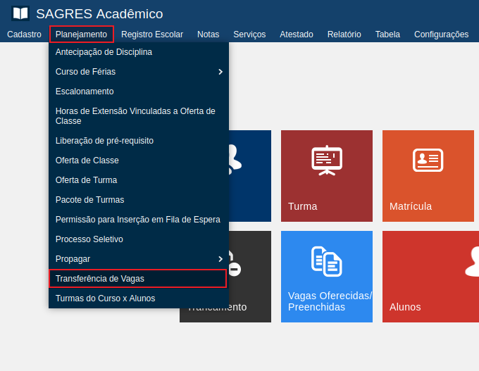 A cada período letivo, geralmente durante o processo de realização da matrícula, existe a necessidade de transferir algumas vagas oferecidas em uma classe/turma de uma Disciplina (Componente Curricular), de um curso para outro, para melhor atender a demanda. Acessível pelo menu Planejamento > Transferência de Vagas, no Sagres Acadêmico 3 Web, no perfil do Secretário.