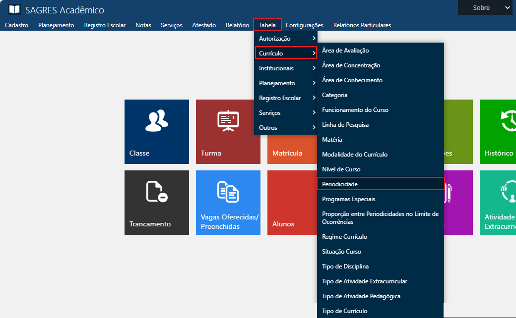 Tabela contendo as periodicidades possíveis para o funcionamento dos currículos dos cursos. Acessível pelo menu Tabela > Currículo > Periodicidade, do Sagres Acadêmico 3 .