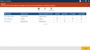 No Regime de Currículo cadastrado será informado como será o controle do cumprimento das grades curriculares, sendo pela creditação ou carga horária dos componentes que a compõem, ou pelo número de séries em que são divididos os componentes das grades, ou por uma combinação dos métodos.
