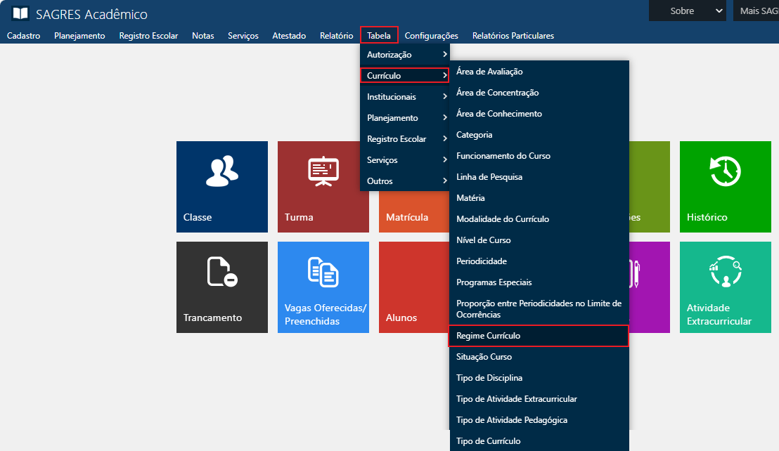 Tabela contendo informações sobre os Regimes dos Currículos dos cursos (currículo seriado, currículo por creditação, etc.) com as definições sobre as características de cada tipo. A inclusão de informações nesta tabela é pré-requisito para o cadastramento dos currículos dos cursos e calculo de série do aluno. Acessível pelo menu Tabela > Currículo > Regime Currículo, do Sagres Acadêmico.
