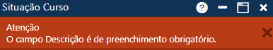 O campo Descrição é um campo de preenchimento obrigatório. Caso esta regra não seja obedecida o sistema irá emitir mensagens de alerta.