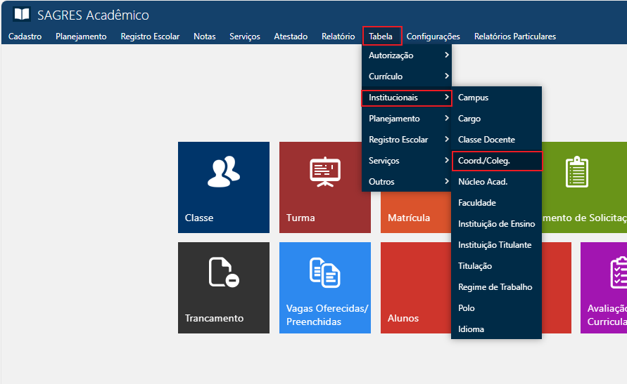 A inclusão de informações na Tabela de Faculdades (ou órgãos equivalentes) e nos Cadastros de Técnicos ou Docentes (onde é possível visualizar e definir as autoridades que serão associadas aos Colegiados) é pré-requisito para o cadastramento dos Colegiados, então é necessário que exista pelo menos um técnico ou docente cadastrado, como autoridade para que o colegiado possa ser criado.