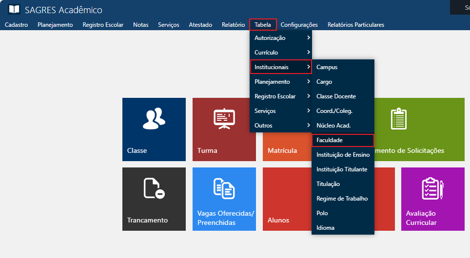 Tabela contendo o nome, a localização e demais informações cadastrais das Faculdades (ou órgãos equivalentes). Acessível pelo menu Tabela > Institucionais > Faculdade, do Sagres Acadêmico 3 Web, no perfil do Secretário.