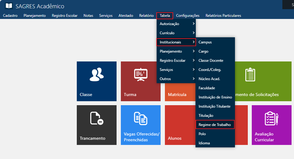 Tabela contendo as descrições dos regimes de trabalho dos docentes na Instituição. Acessível pelo menu Tabela > Institucionais > Regime de Trabalho, do Sagres Acadêmico.