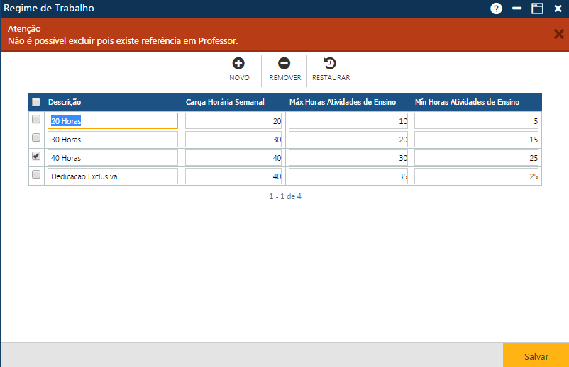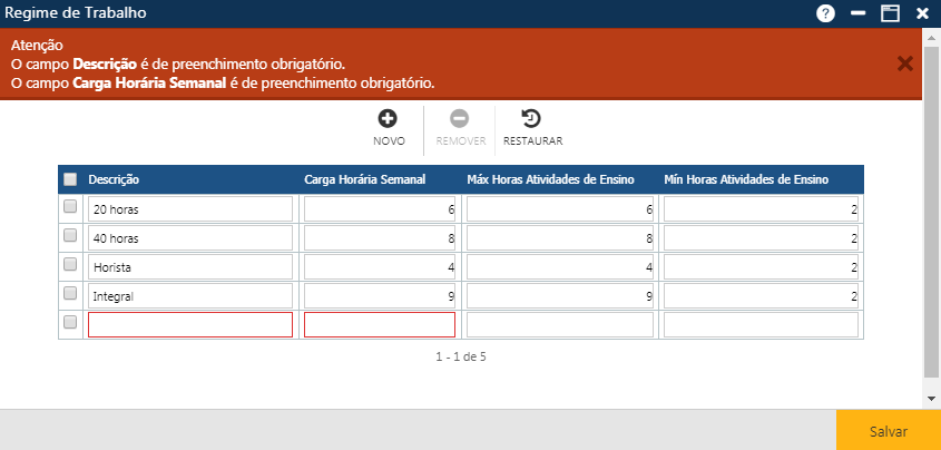 Acionando o botão Novo, o sistema permitirá a inclusão de um novo regime de trabalho. O botão Remover permitirá que o usuário remova um ou mais regimes de trabalho já cadastrados. E finalmente, o botão Restaurar, que permite a recuperação das informações marcadas para remoção, removidas da interface (botão Remover), mas antes do usuário atualizar as informações no sistema (botão Salvar).