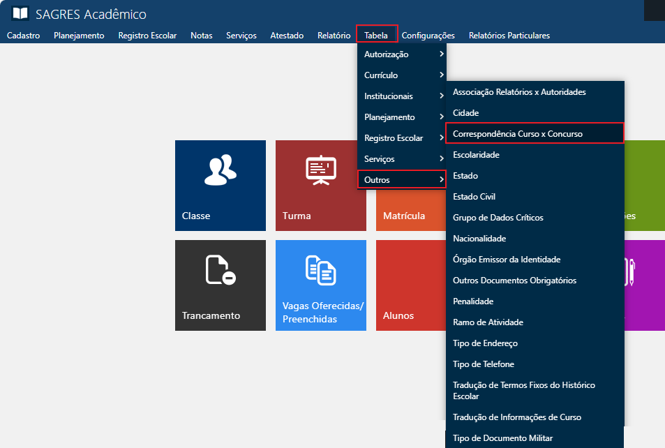 Tabela contendo para cada concurso selecionado, as correspondências entre as opções oferecidas no concurso e as opções de cursos do sistema Sagres Acadêmico, para ingressos vestibulares na Instituição. Acessível pelo menu Tabela > Outros > Correspondência Curso X Concurso, no Sagres Acadêmico 3 Web, perfil do Secretário.