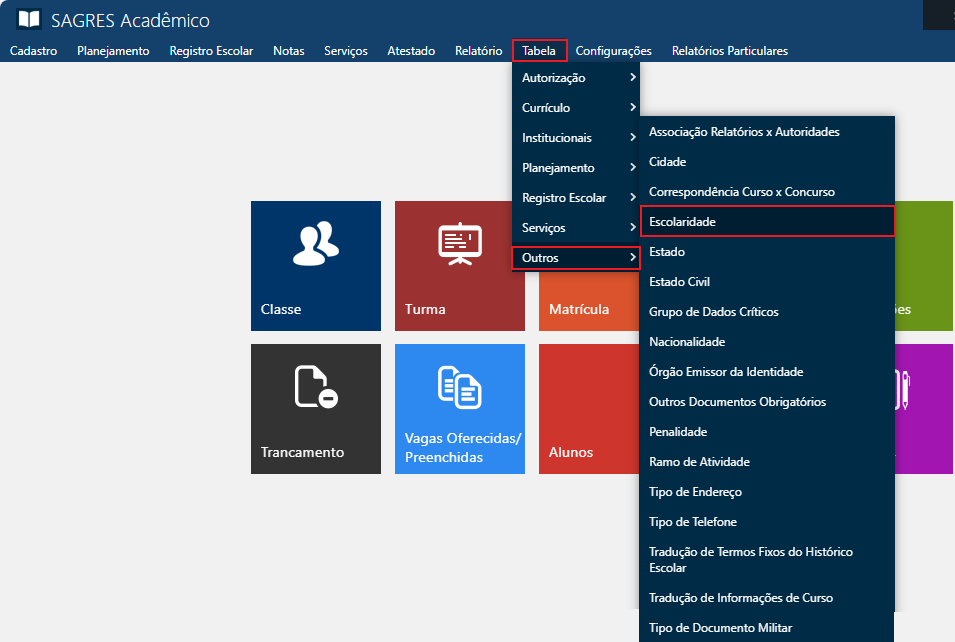 Tabela contendo as descrições das diversas escolaridades possíveis para Alunos, Docentes, Técnicos e Tutores. Acessível pelo menu Tabela > Outros > Escolaridade, do Sagres Acadêmico, no perfil do Secretário.
