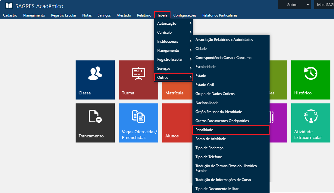 Tabela contendo as descrições das possíveis penalidades que poderão ser impostas aos Alunos que violam alguma regra da Instituição. Acessível pelo menu Tabela > Outros > Penalidade, do Sagres Acadêmico 3 Web, no perfil do Secretário.