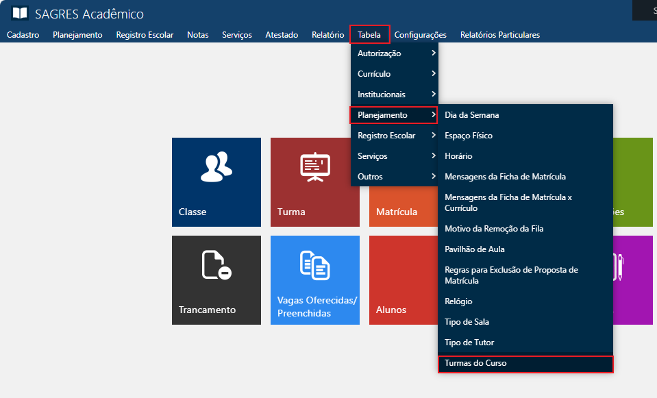 Na Tabela de Turmas do Curso criamos turmas que serão associadas a grupos de Alunos de determinados cursos da Instituição. Em muitas situações (matrícula, por exemplo), para um melhor planejamento acadêmico e execução de serviços, é importante dividir os Alunos em grupos, criando o que chamamos de Turmas dos Cursos. Acessível pelo menu Tabela > Planejamento > Turmas do Curso, do Sagre Acadêmico 3 Web, no perfil do Secretário.