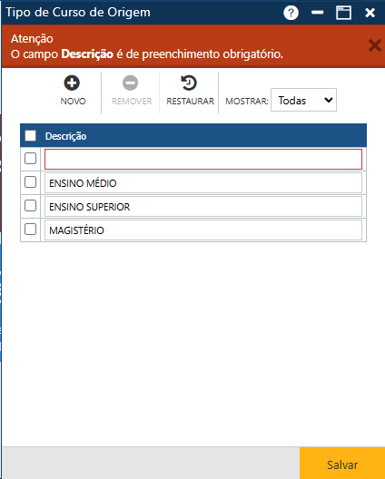 Acionando o botão Novo, o sistema permitirá a inclusão de um novo tipo de curso de origem. O botão Remover permitirá que o usuário remova da interface um ou mais tipos de cursos de origem já cadastrados. E finalmente, o botão Restaurar, que permite a recuperação das informações marcadas para remoção, removidas da interface (botão Remover), mas antes do usuário atualizar as informações no sistema (botão Salvar).