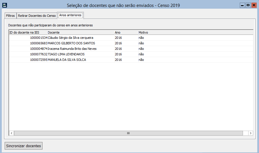 Censo - Configurações - Exceções - Seleção de Docentes que não serão enviados