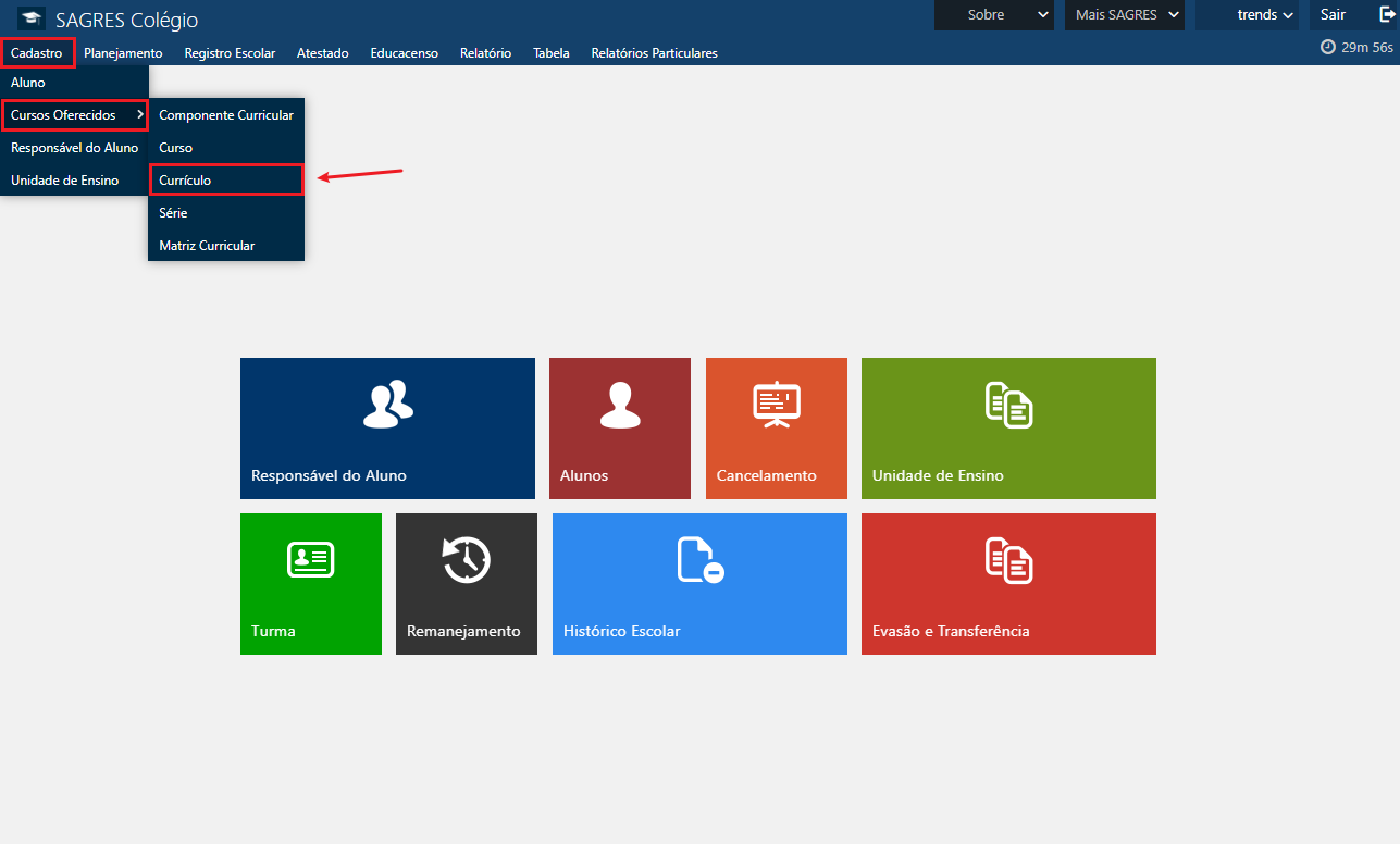Esta tela permite ao Usuário cadastrar e modificar os currículos ou ementas dos cursos oferecidos na Instituição de Ensino. Acessível pelo Menu Cadastro > Cursos Oferecidos > Currículo do Sagres Colégio.