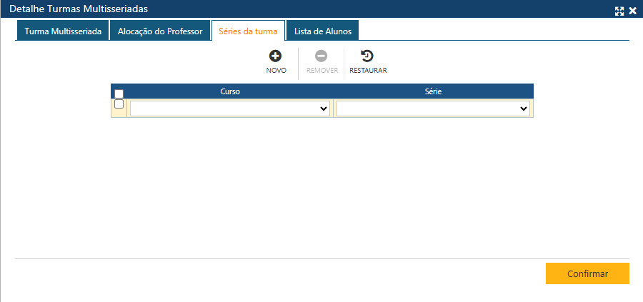 Acionando o botão Novo, o sistema permitirá incluir uma nova Série para a Turma. O botão Remover permitirá que o usuário remova da tela uma ou mais Séries já cadastradas. Por fim, o botão Restaurar permitirá a recuperação das informações marcadas para remoção (botão Remover), antes do usuário atualizar as informações no sistema (botão Salvar).