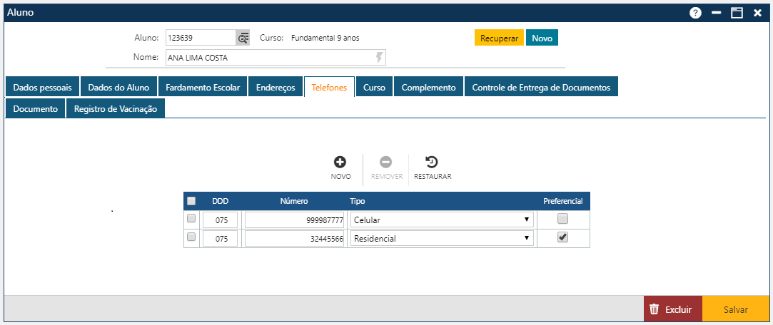 Use os botões Novo / Remover / Restaurar para atualização do registro de Telefones.