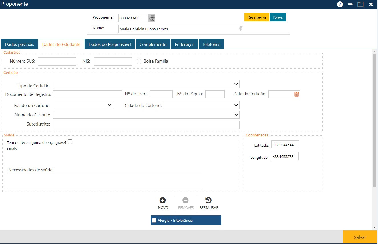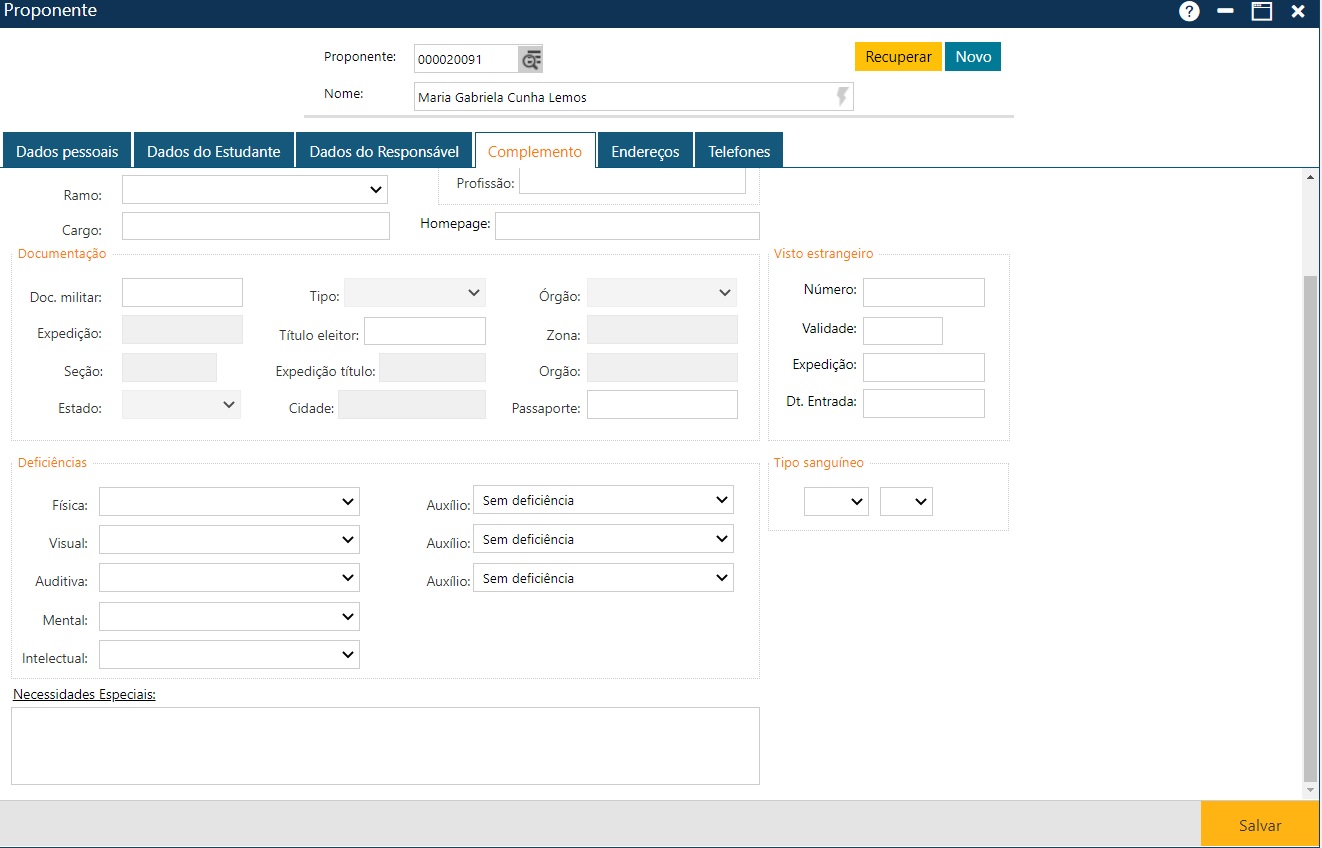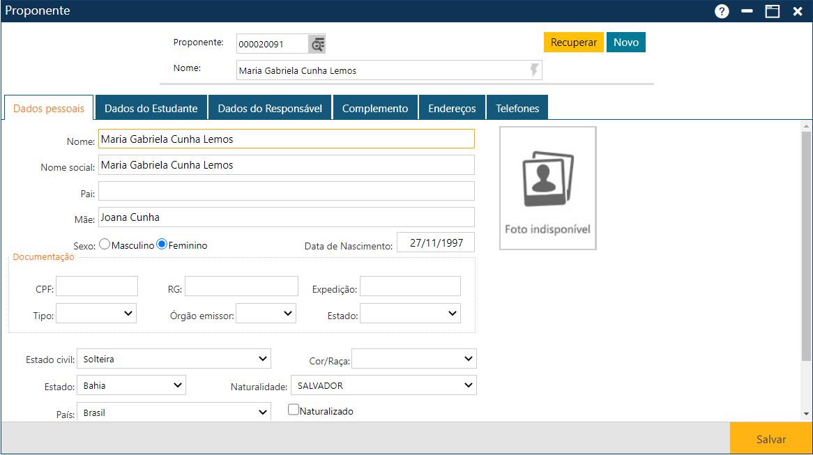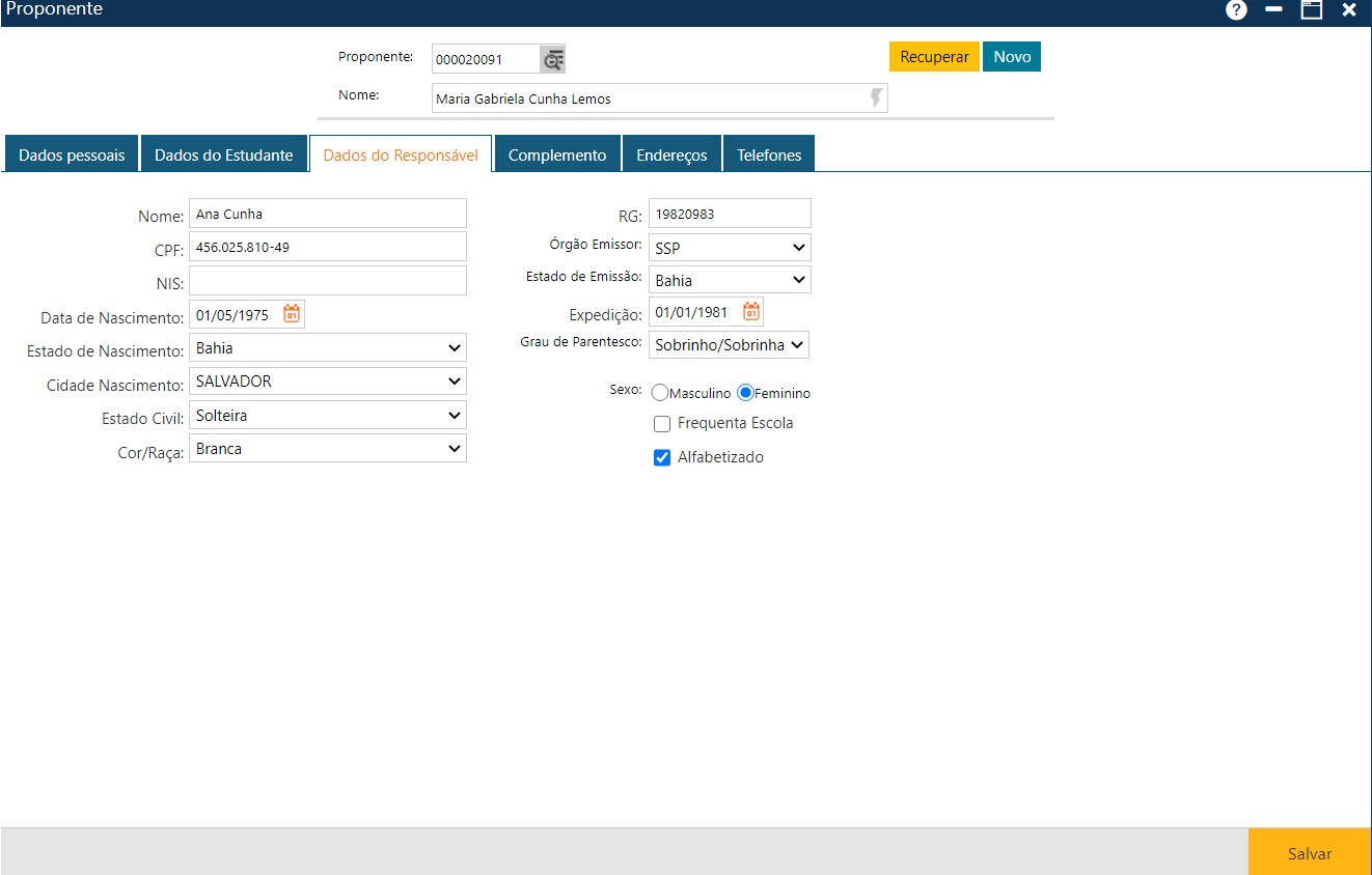 Ao pressionar o botão Recuperar, será exibida a interface com os dados do estudante. A mesma interface será exibida quando acionado o botão Novo e será possível então o preenchimento dos dados do estudante e responsável.