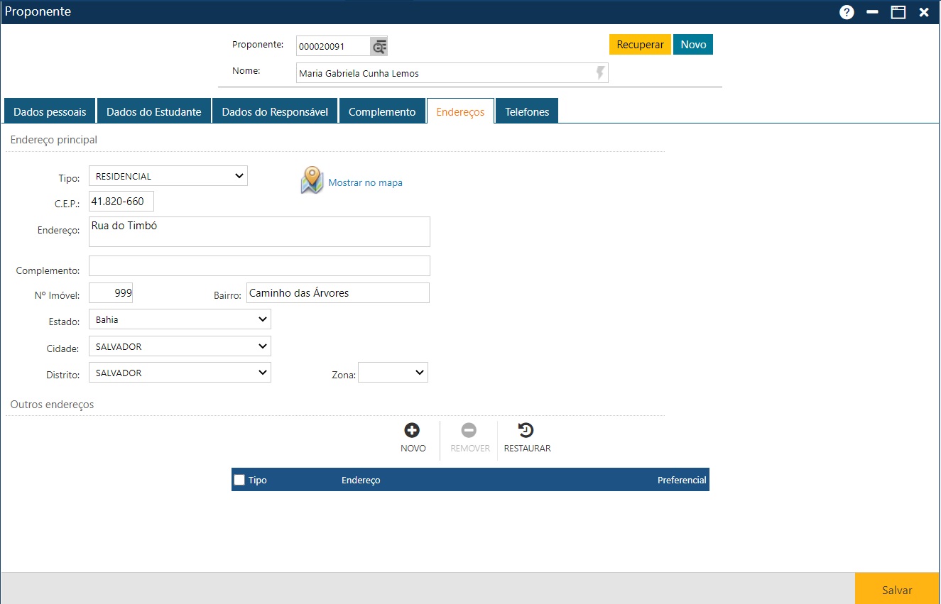 Nesta pasta são registrados o Endereço Principal e Outros Endereços.