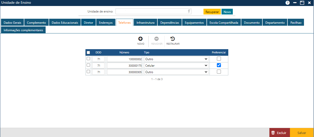 O sistema não obriga o preenchimento de informações nas demais pastas: Telefone, Infraestrutura, Dependências, Equipamentos, Escola Compartilhada, Documento, Departamento, Pavilhão. Contudo, é aconselhável o preenchimento, principalmente quando se trata de dados que são enviados anualmente para o Censo do Ensino Básico.