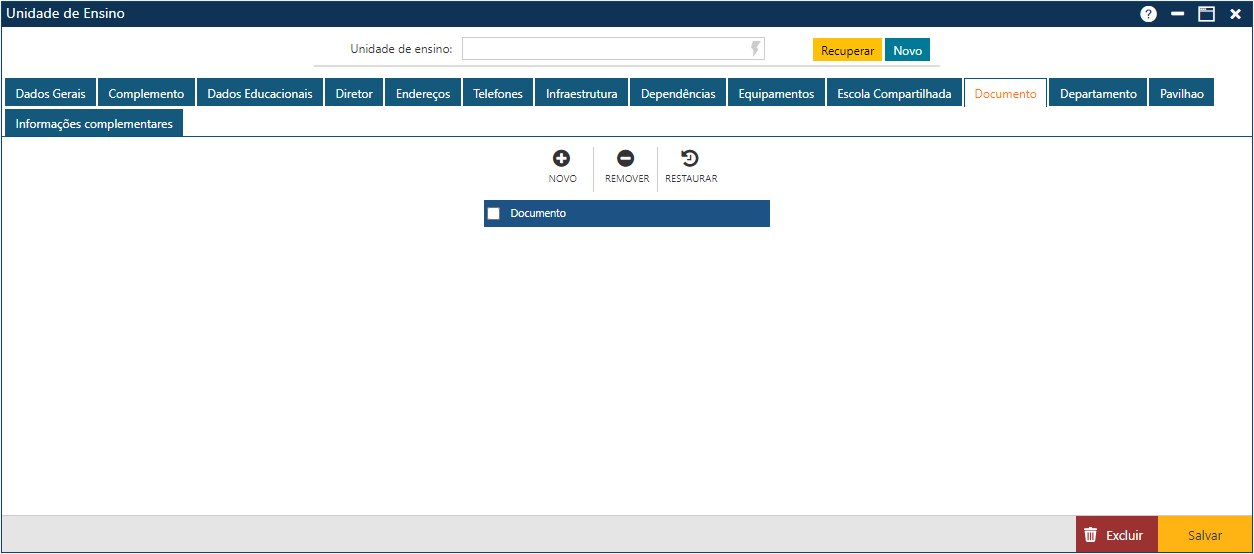 Acionando o botão Novo, o sistema abrirá a tela para o Usuário registrar os dados da nova Unidade de Ensino. A tela é composta por 10 pastas: