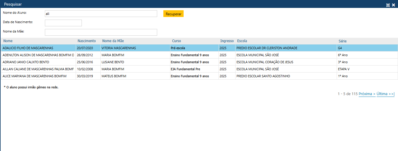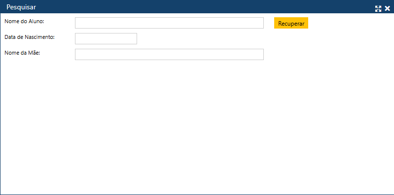 Nessa tela, é possível buscar o Aluno desejado pelo Nome do Aluno (preenchimento obrigatório), pela Data de Nascimento e/ou pelo Nome da Mãe.