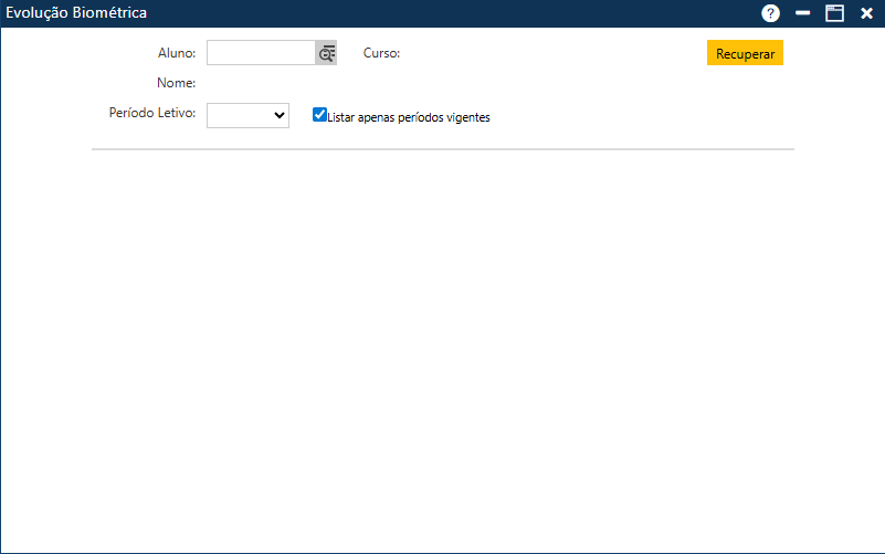 Após selecionar um Aluno, é necessário selecionar o Período Letivo que se deseja visualizar. Em seguida, deve ser acionado o botão Recuperar para que sejam exibidos os cadastros de Evolução Biométrica já existentes do Aluno selecionado.