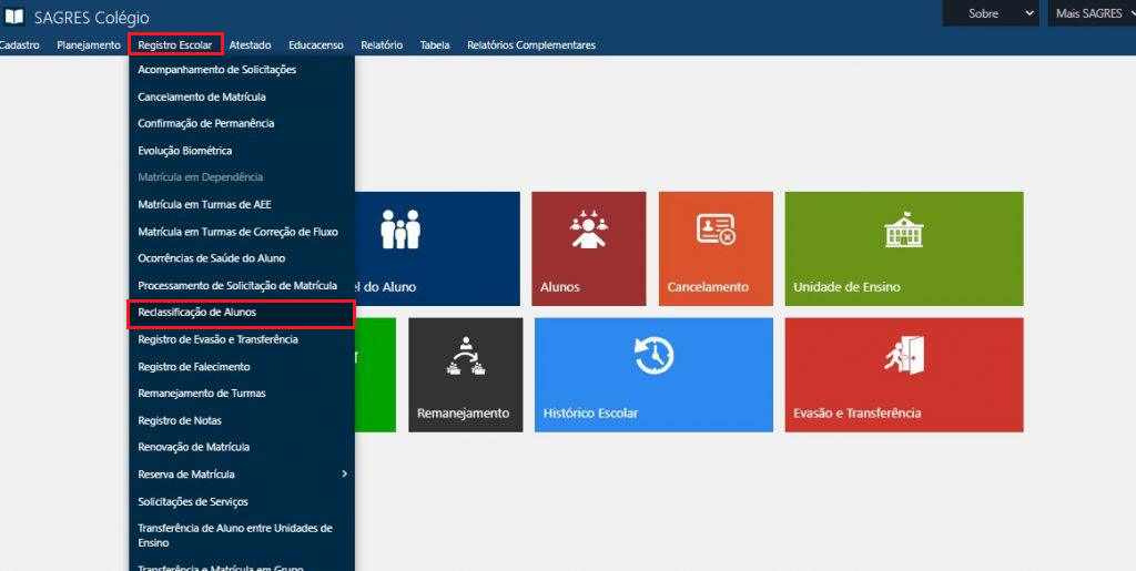 Menu > Registro Escolar > Reclassificação de Alunos.