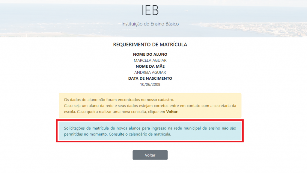 Caso o sistema não identifique os dados de cadastro do estudante, será exibida a mensagem “Os dados do aluno não foram encontrados no nosso cadastro. Caso seja um aluno da rede e seus dados estejam corretos entre em contato com a secretaria da escola. […]”.