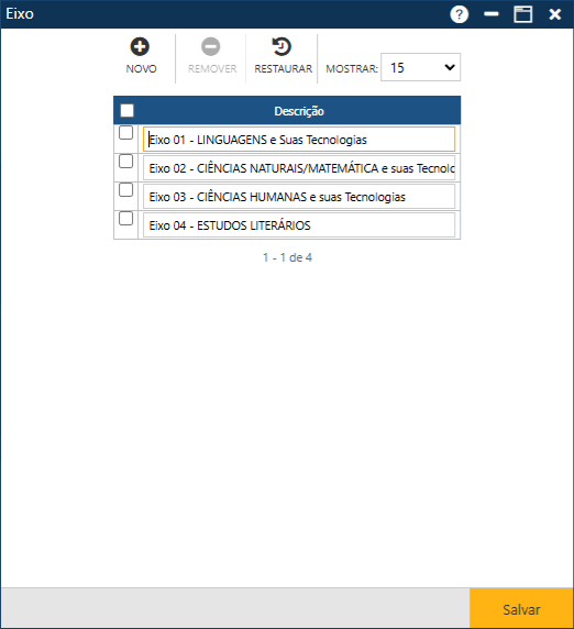 Acionando o botão Novo, o sistema permitirá a inclusão de um novo eixo. O botão Remover permitirá que o usuário remova uma ou mais escolaridades já cadastradas. E finalmente, o botão Restaurar, que permite a recuperação das informações marcadas para remoção antes do usuário atualizar as informações no sistema (botão Salvar, canto inferior da interface).