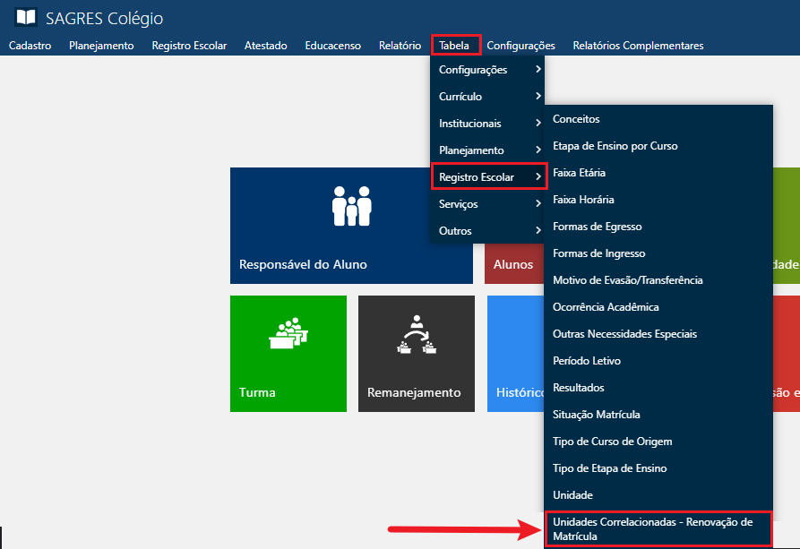 Para cadastrar a correlação entre Unidades de Ensino, acesse o menu Tabela > Registro Escolar > Unidades Correlacionadas – Renovação de Matrícula, do SAGRES Colégio, como ilustrado abaixo: