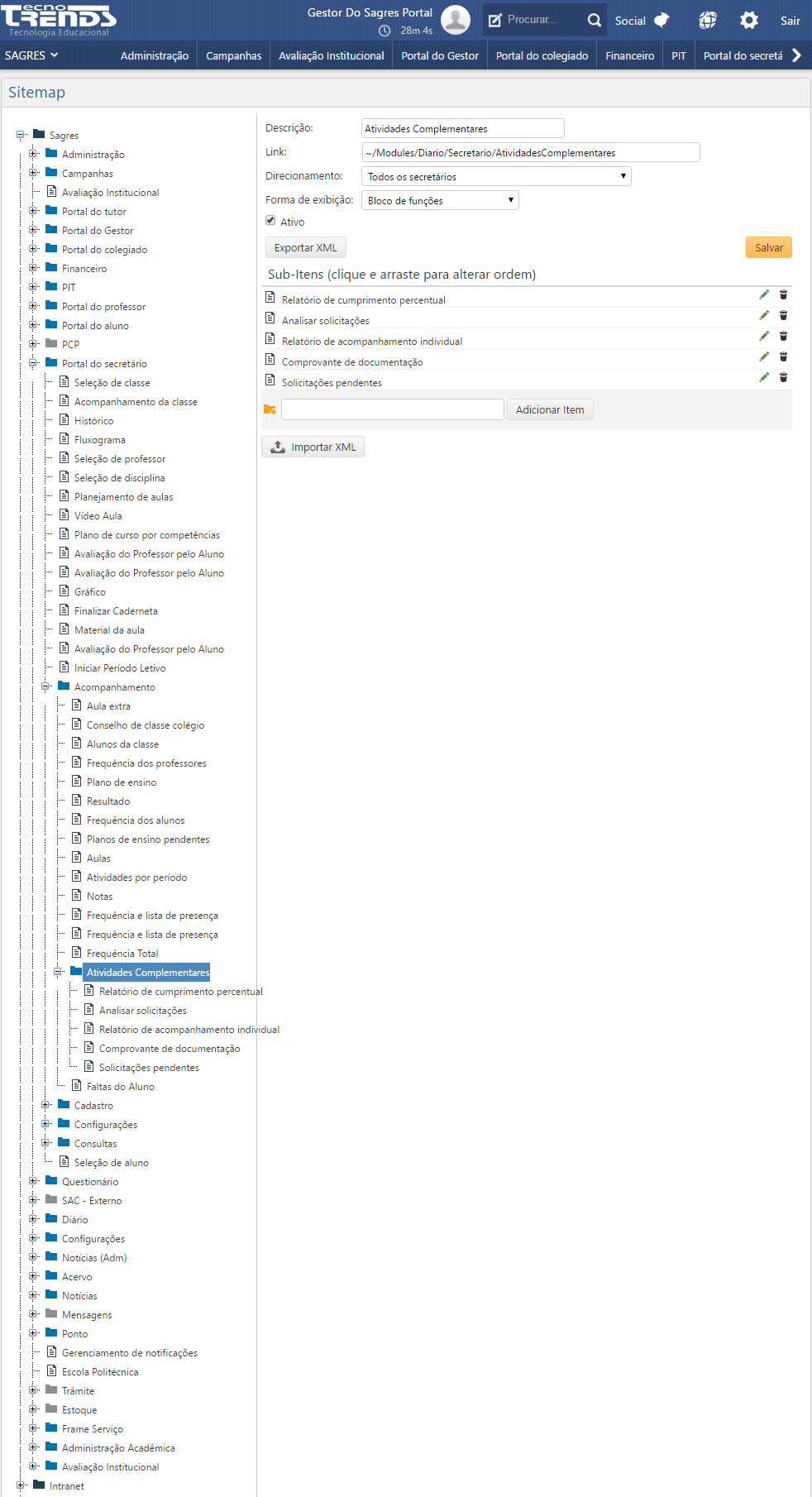 ​As alterações feitas no SiteMap só terão efeito assim que o usuário logado sair da aplicação e fizer o login novamente. O SiteMap é carregado no primeiro acesso do usuário ao Portal e seus Módulos, e, por isso, as alterações só surtirão efeito após um novo login.