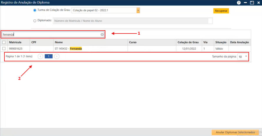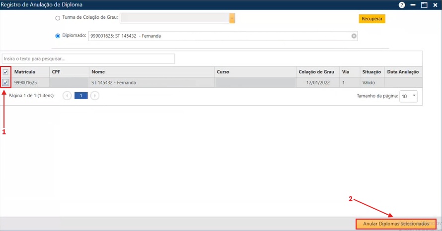 Para realizar a anulação, o usuário deve marcar a caixa de seleção (seta 1) correspondente ao aluno cujo diploma deseja anular. No caso do filtro “Turma de Colação de Grau“, é possível selecionar mais de um diploma por vez. Em seguida, é preciso acionar o botão Anular Diplomas Selecionados (seta 2), localizado no final da interface.