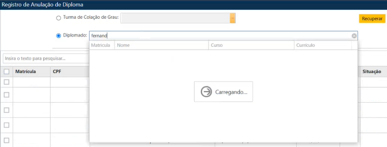 O usuário deve, primeiramente, marcar a opção “Diplomado“. Dessa forma, a caixa de texto para informar o aluno ficará habilitada. Essa caixa de texto é do tipo autocompletar, assim, ao inserir os primeiros caracteres do nome ou da matrícula de um aluno, o sistema exibe uma lista com todas os alunos que correspondem às informações fornecidas para que o usuário selecione a opção desejada. Em seguida, o usuário deve acionar o botão Recuperar.