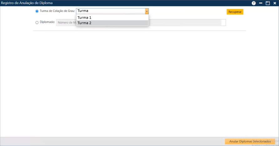 - Turma de Colação de Grau – permite selecionar um ou mais diplomas de alunos de uma mesma Turma;