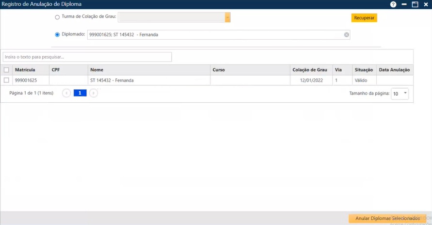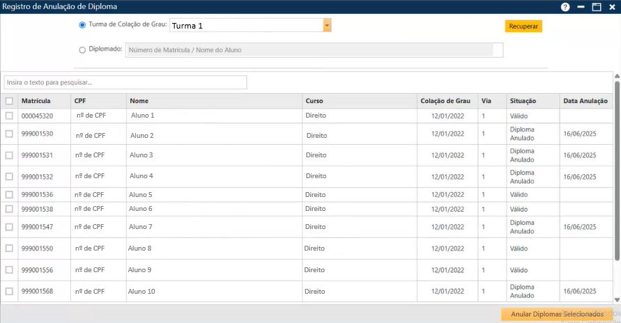 - Aluno – informa o nome do aluno cujo diploma foi anulado;