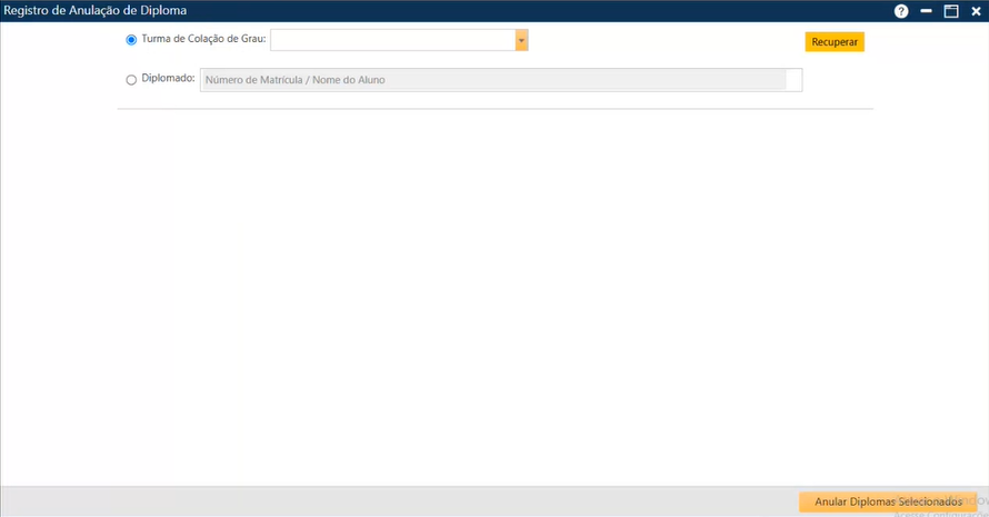 Após acessar o menu indicado acima, o sistema apresenta a interface Registro de Anulação de Diploma, como demonstrado a seguir: