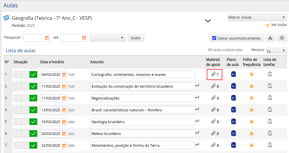 - Número das aulas em sequência;