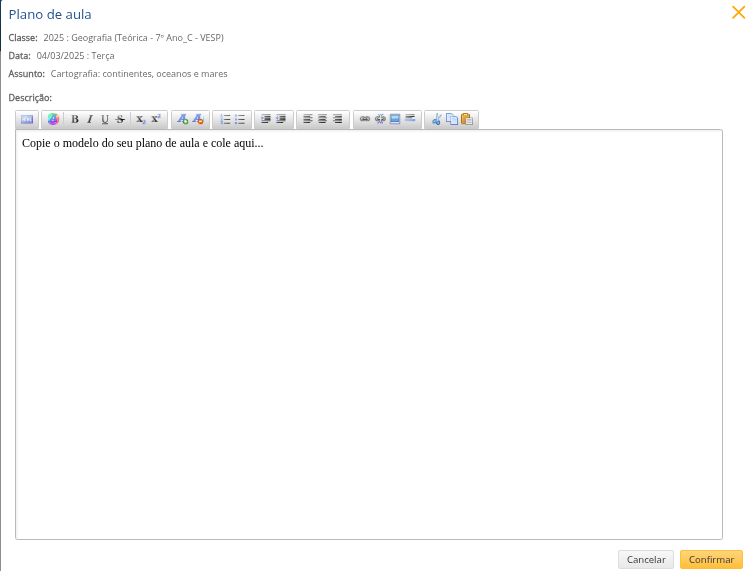 Ao selecionar o ícone Plano de aula na linha da aula desejada, o sistema abre uma janela de edição onde é possível inserir ou atualizar a descrição do planejamento da aula.