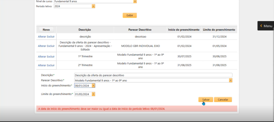 Esta rotina permite Cadastrar um parecer descritivo como forma de avaliação de desempenho do aluno no ano letivo.
