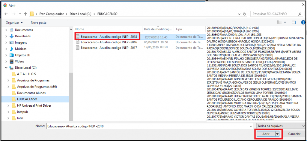 Ao clicar no campo Arquivo, a aplicação abrirá a página para pesquisa e localização do arquivo baixado do site do INEP pelo Usuário.