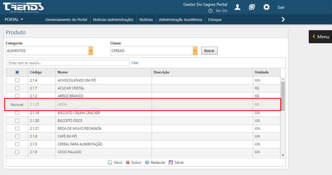 O botão restaurar ao ser usado volta as configurações originais da interface, conforme ao momento que houve a busca. Depois é preciso clicar no botão Salvar para que o sistema conserve as novas alterações.